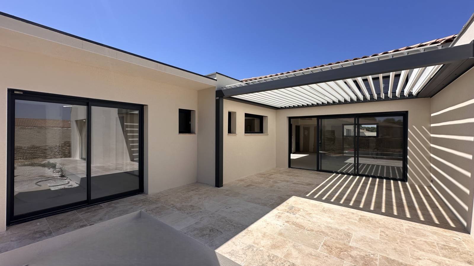 Les menuiseries extérieures sont en aluminium noir anthracite, un choix à la fois sobre et contemporain qui s’harmonise parfaitement avec les lignes de la maison.